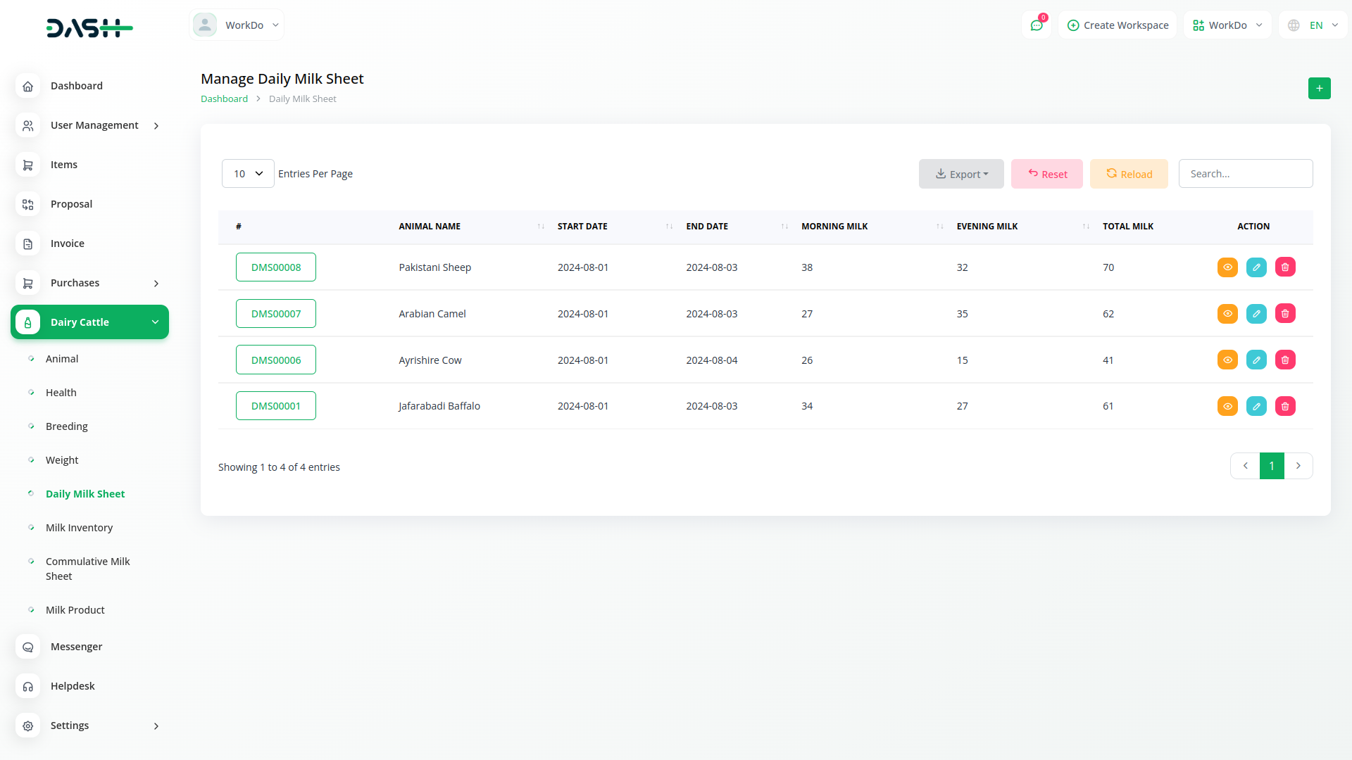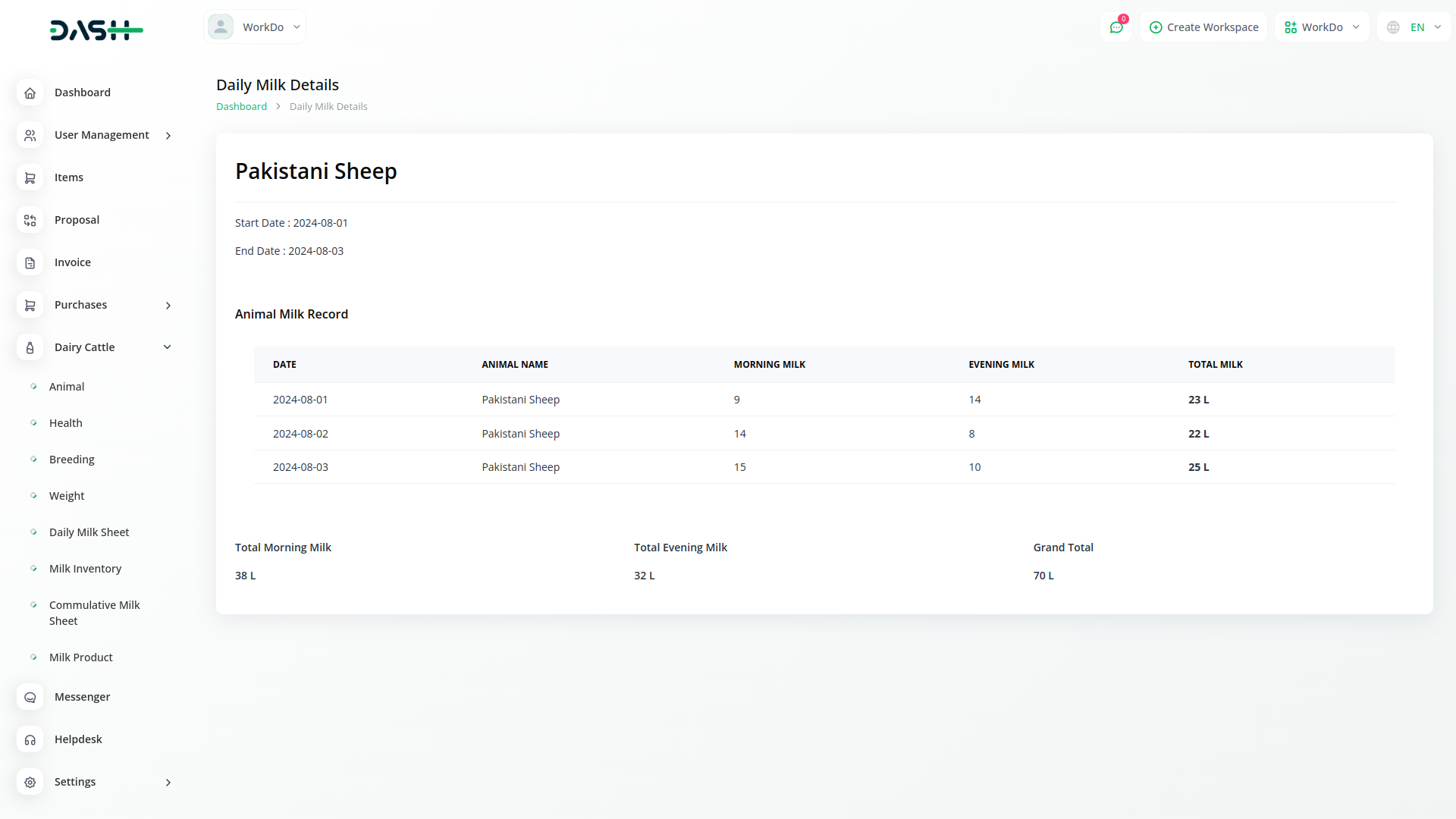 Dairy and Cattle Management module is your comprehensive solution for dairy cattle management. Our platform is designed to simplify the complexities of managing a dairy farm, offering seamless integration for tasks such as animal health monitoring, breeding management, weight tracking, daily milk yield recording, and milk inventory management. With Dash SaaS, you can efficiently oversee all aspects of your operation, ensuring the well-being of your herd while maximizing productivity.
