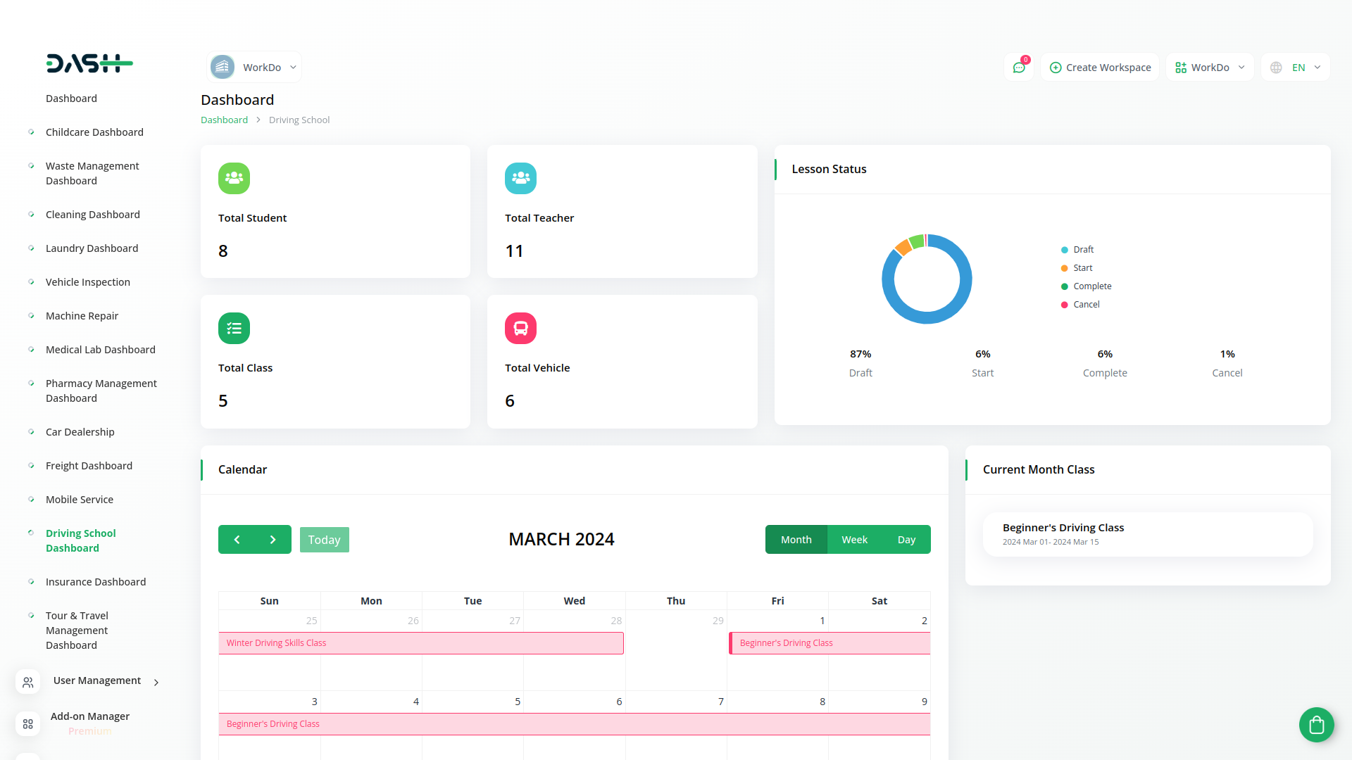 Effortlessly manage students, vehicles, classes, lessons, and invoices in one streamlined platform within Dash SaaS, enhancing efficiency and organization for your driving school operations.