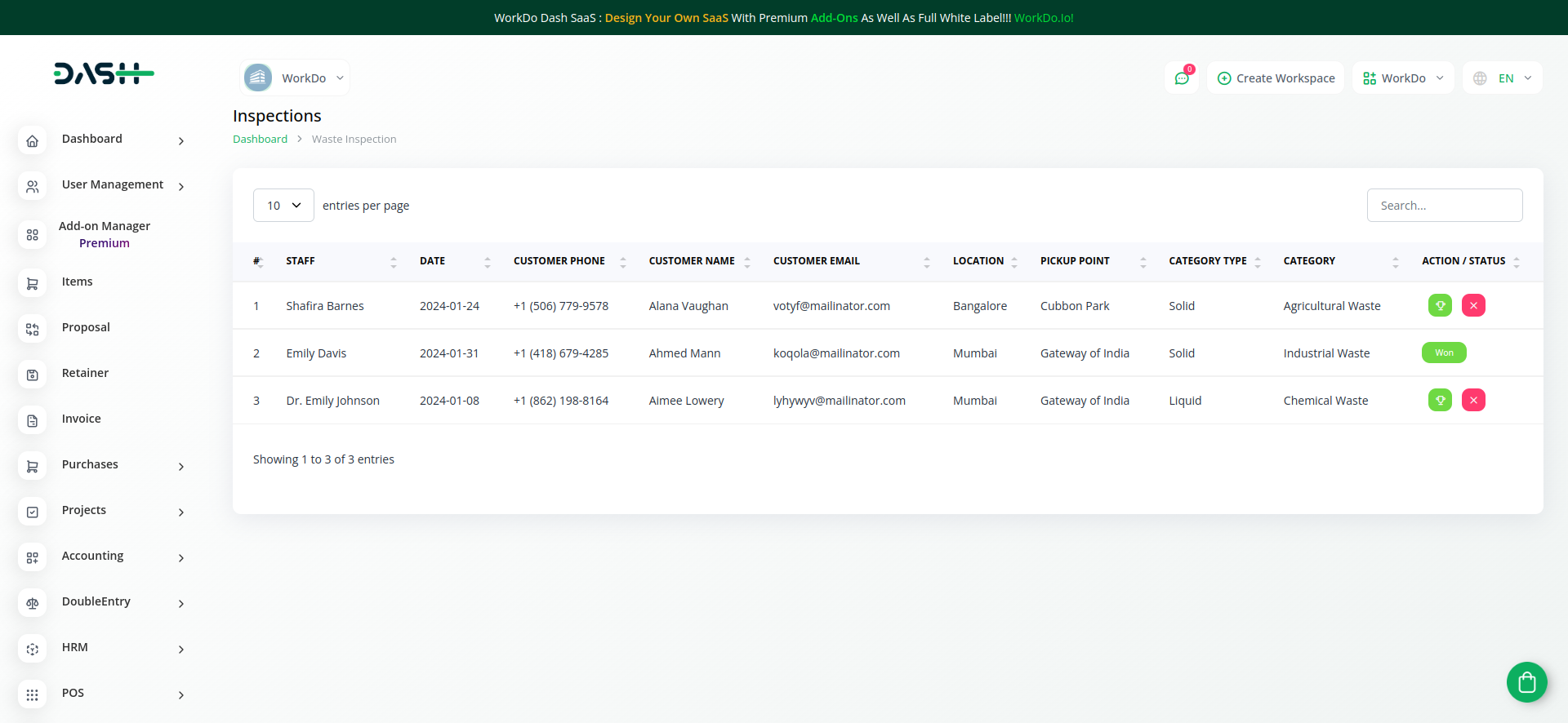 Efficiently conduct inspections on collected waste to ensure quality and compliance, with the ability to mark inspections as "Passed" or "Rejected" based on predefined criteria