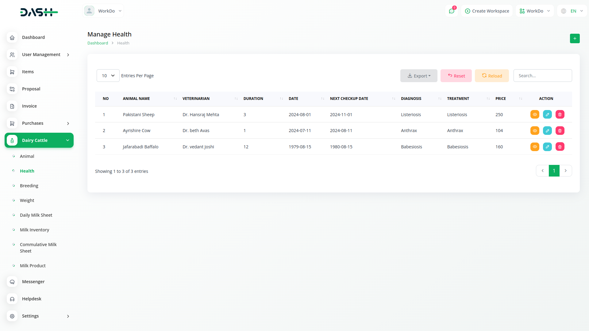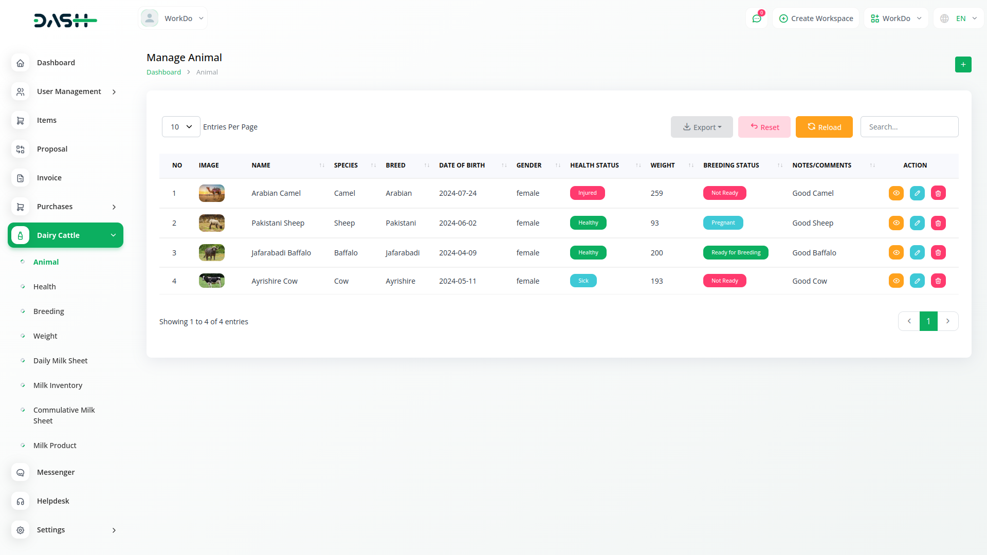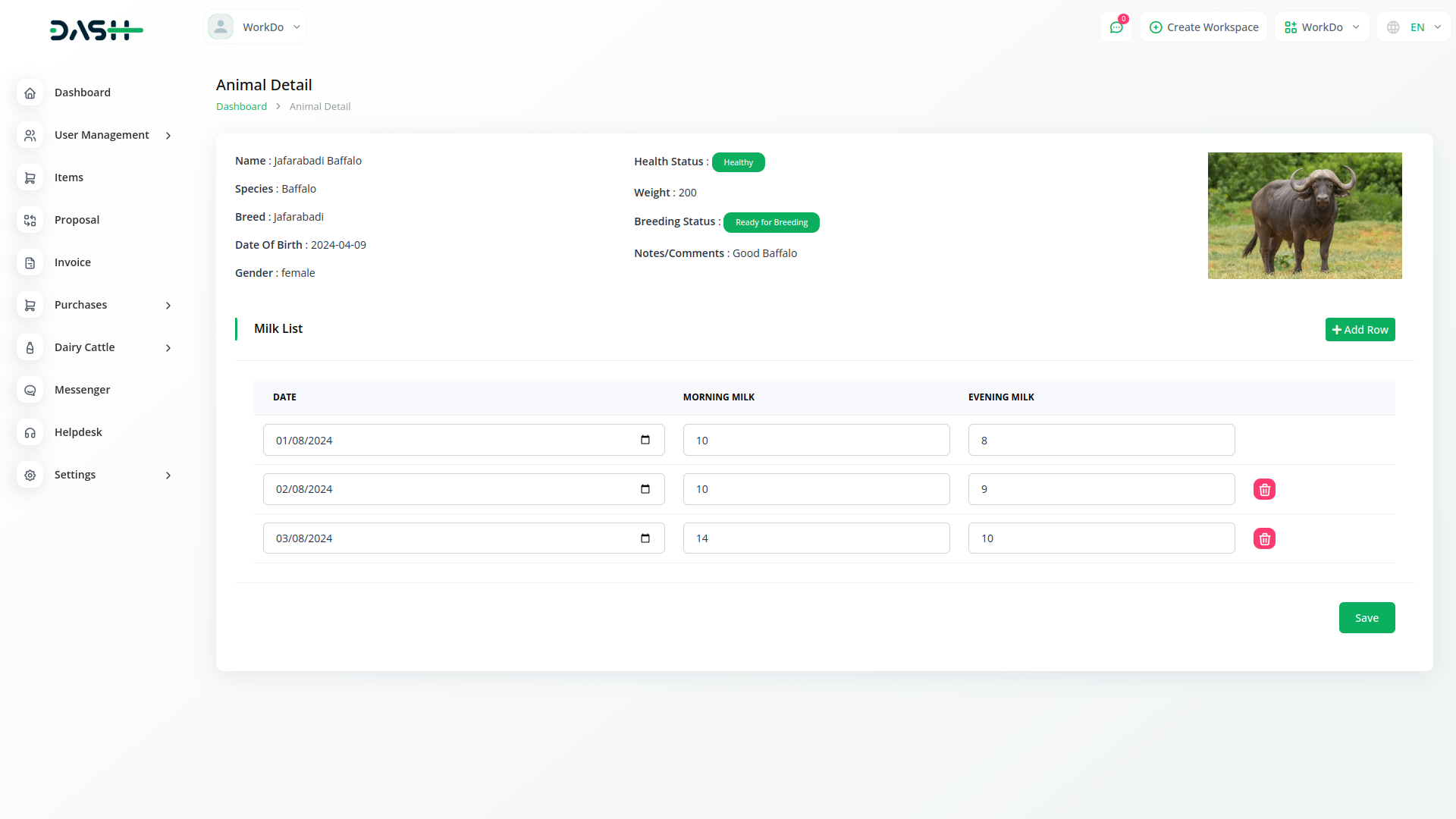 Dairy and Cattle Management module is your comprehensive solution for dairy cattle management. Our platform is designed to simplify the complexities of managing a dairy farm, offering seamless integration for tasks such as animal health monitoring, breeding management, weight tracking, daily milk yield recording, and milk inventory management. With Dash SaaS, you can efficiently oversee all aspects of your operation, ensuring the well-being of your herd while maximizing productivity.
