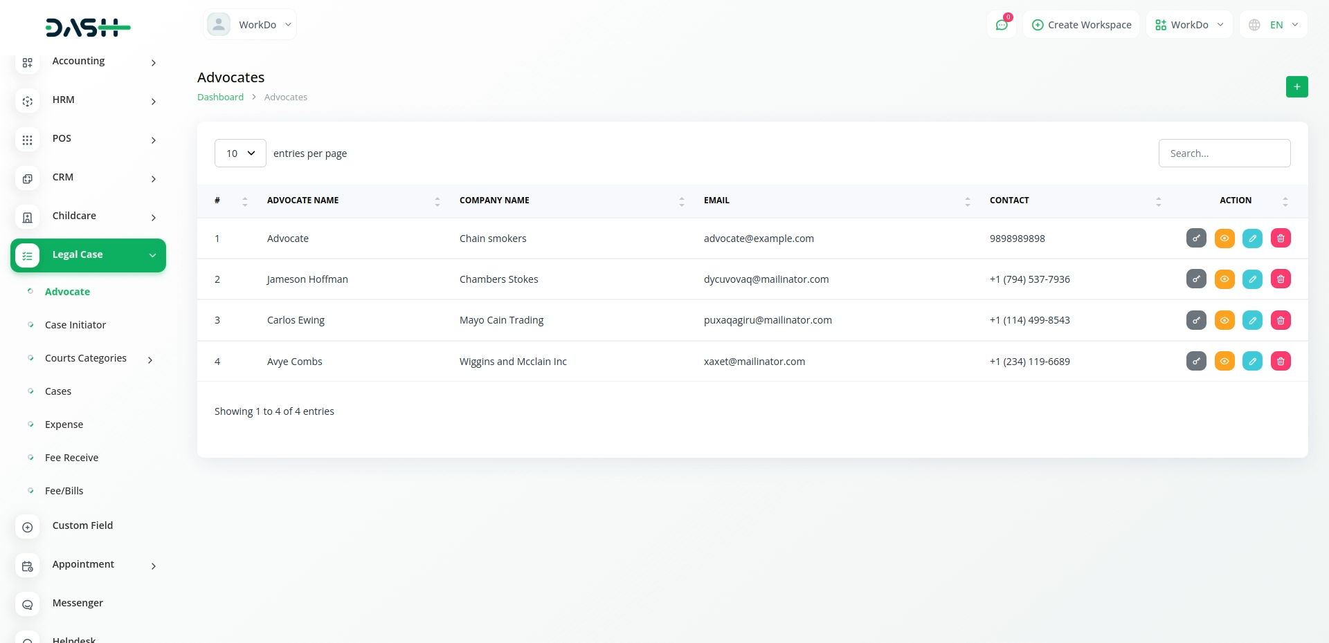 For advocates, the module offers a straightforward way to view and handle details such as names, company affiliations, and contact information. It provides essential actions like editing advocate information, resetting passwords, and deleting advocate records. This ensures that user interactions with advocate data are intuitive and effective.