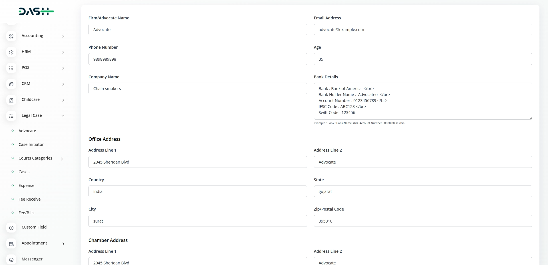 Explore the efficiency of the Dash SaaS Legal Case Management Hub, a dedicated tool designed for streamlined management of advocates, case initiators, and legal proceedings.With a user-friendly interface, this module simplifies advocate details, offering actions like editing information, resetting passwords, and deleting records. Gain insights into case details, client hearings, bills, and fees for efficient case initiator management.