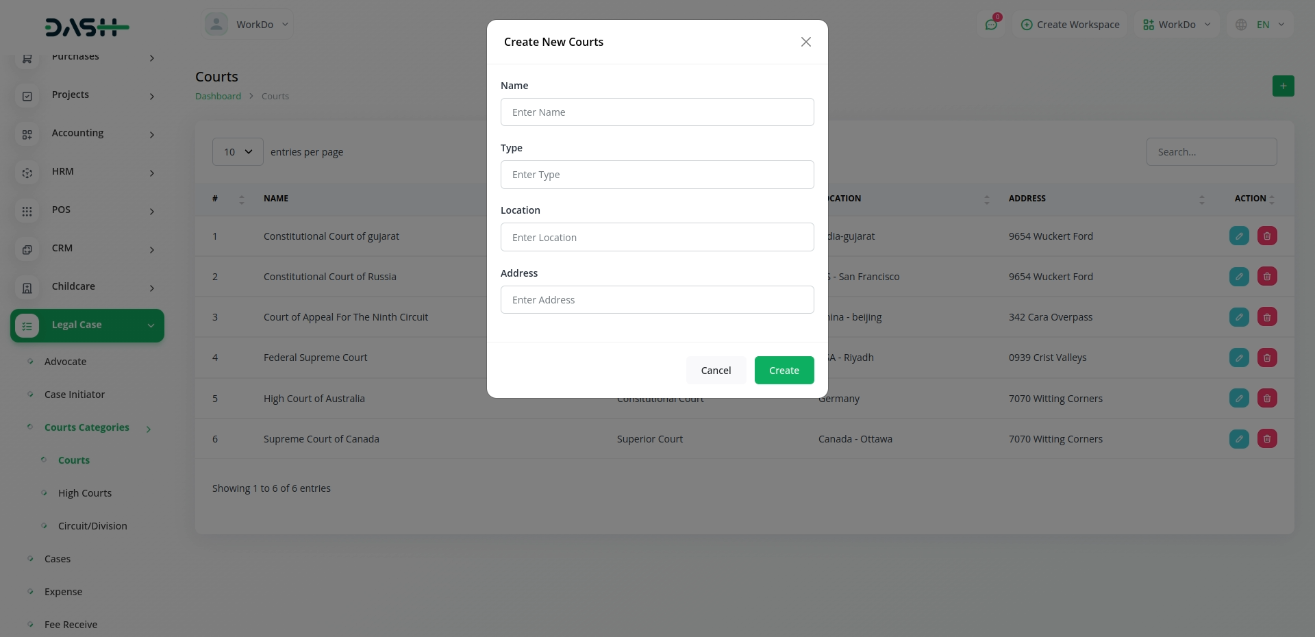 The Legal Case Management module in Dash SaaS is a dedicated tool for simplifying legal processes. With a user-friendly interface, it allows users to efficiently manage information related to advocates, case initiators, and court categories. This module serves as a central hub, facilitating the organization and accessibility of critical legal data within the broader Dash SaaS platform.