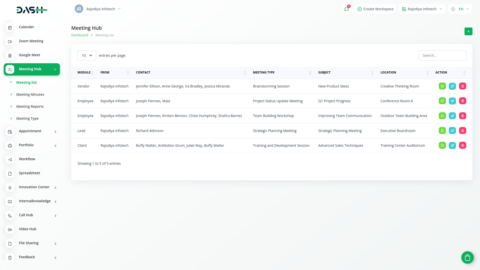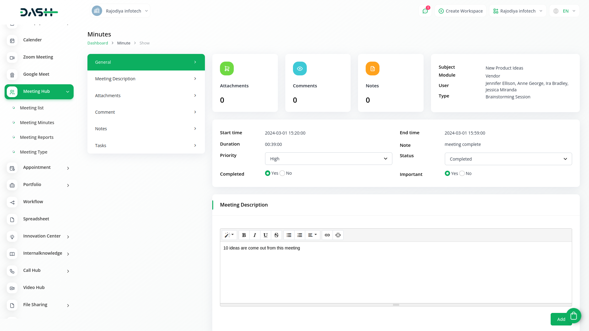 Welcome to the Dash SaaS Meeting Hub Module! Our platform empowers you to efficiently manage all aspects of your meetings, including minutes, lists, reports, and types. With intuitive features and seamless integration, you can enhance collaboration and productivity within your organization.