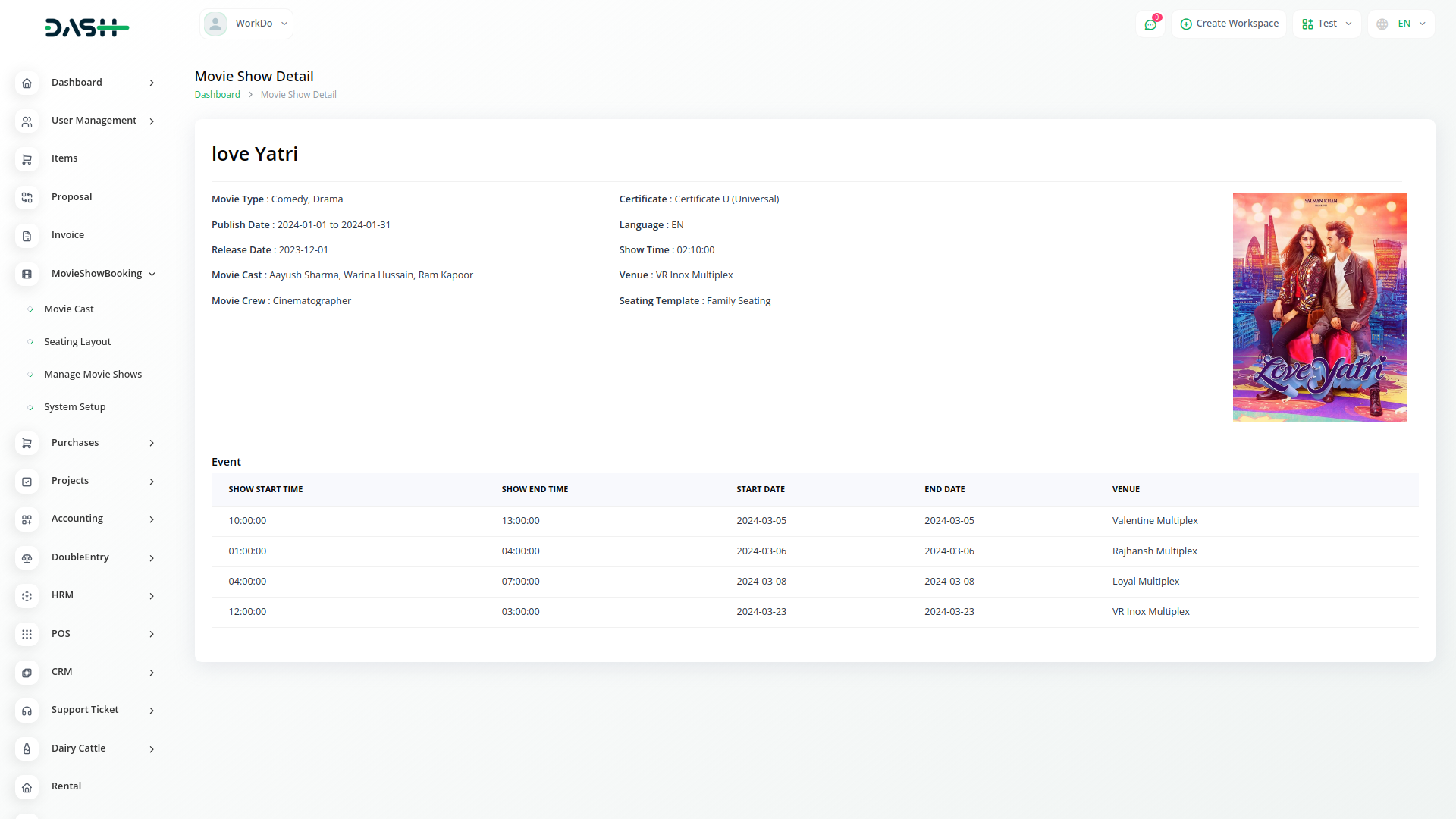Welcome to Dash SaaS Movie Show Booking Management Integration, your comprehensive solution for streamlined movie theater operations. With our specialized module, you can effortlessly access movie cast information, customize seating layouts, manage movie shows, and configure your system setup all from one convenient platform.