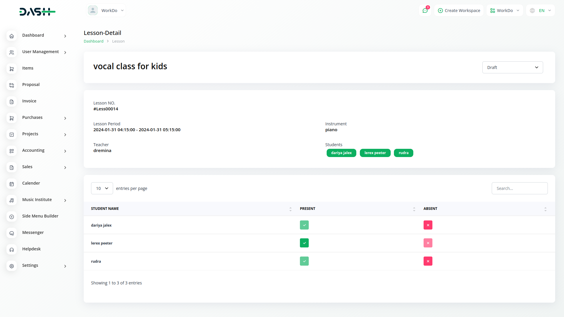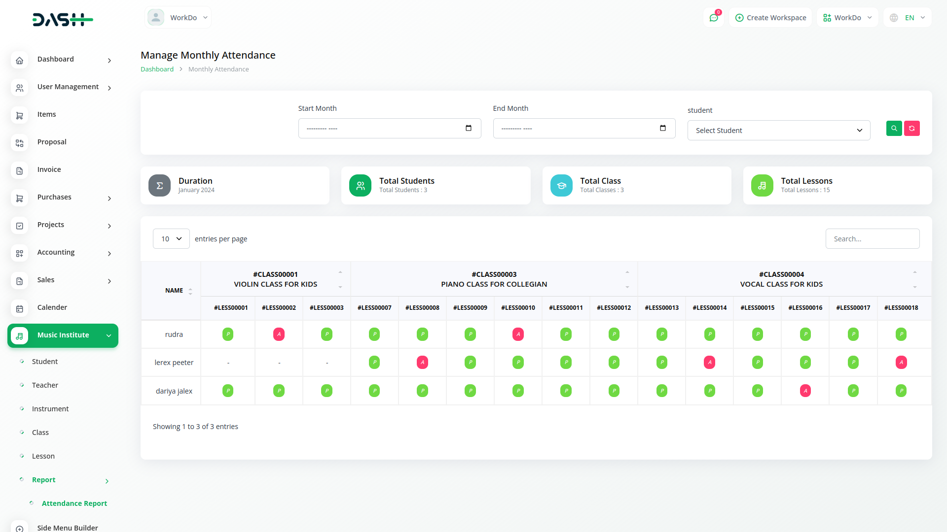 Dash SaaS`s Music Institute Module is like a musical playground, simplifying class details, attendance, and logins for students and teachers to enjoy a harmonious learning experience.