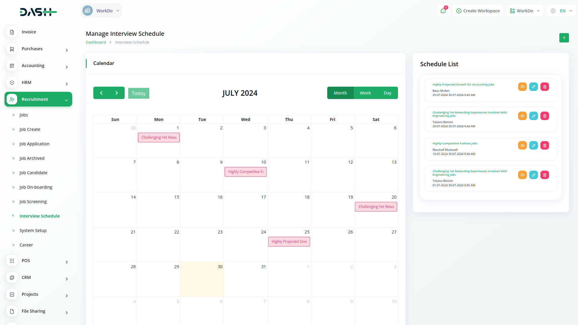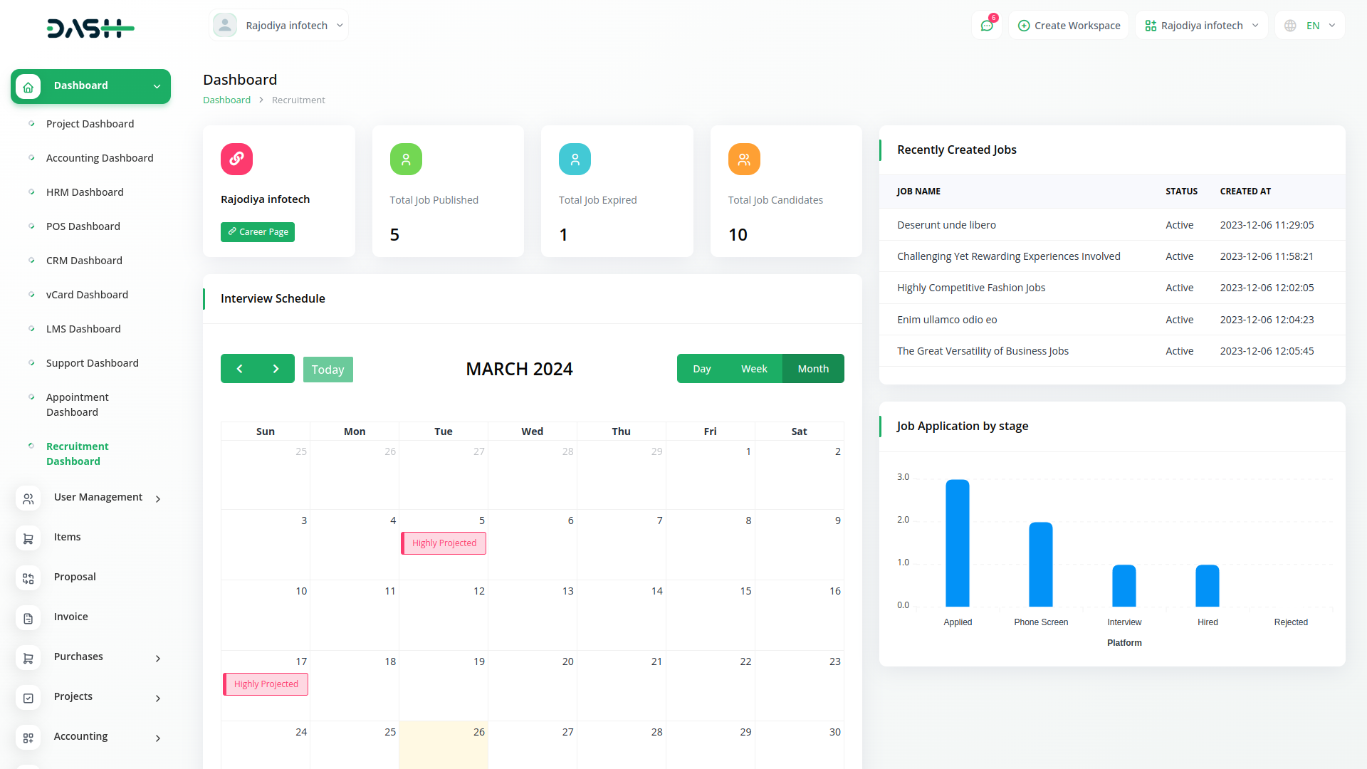 The Dashboard of Recruitment module provides users with an immediate overview of their recruitment activities. It presents key metrics such as the total number of jobs published, expired listings, and the current count of job candidates. Additionally, users can easily view their interview schedule through an interactive calendar and stay updated on recently created job listings and job applications by date. This real-time monitoring tool empowers users to make informed decisions and effortlessly stay on top of their hiring processes.